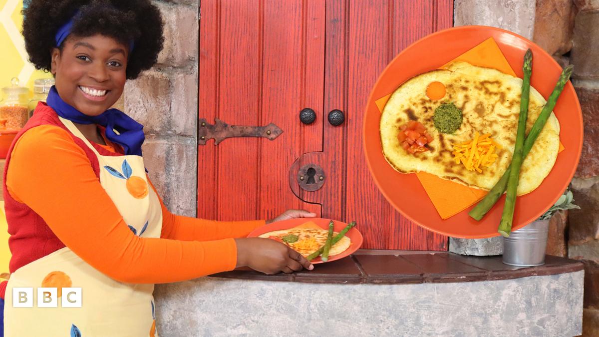 To serve the palette pancake, cut a little ‘thumb hole’ in the side and add your dollops of paint. We’re using basil pesto for green paint, chopped tomatoes for red paint and yummy Red Leicester cheese for orange! But you can make any paint toppings you like.