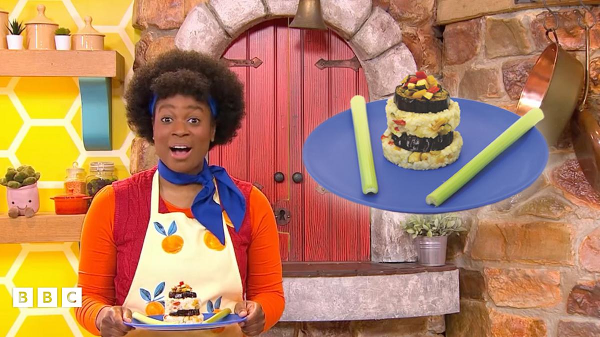 Place a roasted aubergine slice on top. Then use the cutter again, to plate up the top layer of your risotto drum. This may be fiddly, so you might need a grown-up helper’s help!