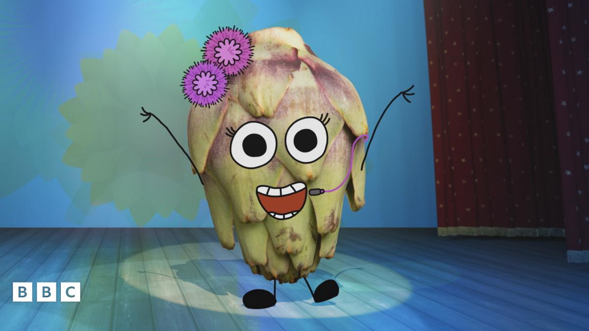 Live from the Roots and Fruits theatre, it’s the rhyming queen Artichoke performing her lovely song I’m a Little Artichoke with a little help from Chicory.