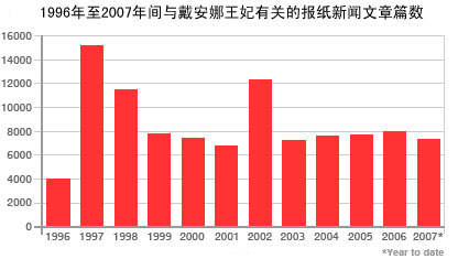 戴安娜王妃车祸过世已经10年了,但是报章杂志报道她的热衷程度依然不减。 随着戴安娜王妃逝世10周年的日子逐渐迫近,英国各报纸成天围绕着有关戴安娜王妃的消息,相关文章照片不计其数。 从《泰晤士报》到《每日快报》,不论是大报还是小报,几乎没有一个星期看不到有关戴安娜王妃的相关报道,尤其是《每日快报》,报道标题偏爱使用“目击”、“丑闻”、“揭发”等耸动字眼。 根据一项针对过去10年英国报纸杂志所作的调查发现,戴安娜王妃的名字每年上报上杂志次数超过8,000次以上。 今年才到8月而已,报章杂志上已经出现过7,000多次有关戴安娜王妃的报道,预料戴安娜王妃逝世10周年,媒体报道热度将突破2002年逝世5周年的程度。 除了报章杂志以外,电视和广播也对戴安娜王妃相关话题持续报道,另外有关戴安娜王妃的书籍出版品更是不胜枚举,各种话题包罗万象。