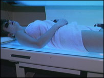 说是差不多,假冒古铜色,无论是自己抹,还是专业人士给抹,能达到以假乱真的程度却很难。于是,一些全年候古铜色的名人、政客成了媒体挖苦奚落的笑料也就在所难免。 去年的英国皇家赛马大会Ascot的组织者忍无可忍,禁止那些“古铜妆”抹得太差,露出纹理破绽的观赛者入场。 躺在太阳…床上 如果不去躺在太阳下晒,仍然要保持一年四季跟晒太阳效果一样的古铜肤色,那只有一个办法,就是上太阳床,sunbed。 晒太阳皮肤变色,是太阳光中的紫外线,ultra-violet radiation照射皮肤所致。太阳床实际上就是个紫外线灯箱,让人躺在紫外线灯下烤。 所不同的是,现代的太阳床发出的紫外线强度,是太阳光紫外线强度的十几倍甚至几十倍。