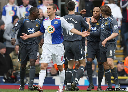 布莱克本 3-1 维冈:克鲁兹第12分钟头球破门,队友相拥庆贺。