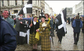 With black and gold being the prominent Cornish colours, daffodils outside the Wig and Pen public house, with the black uniforms of the watching police as the parade went by, provided an artistic framing for the dozens of photographers thronging River Street.  | | Ruth and Clarice proudly wear their Cornish tartan |