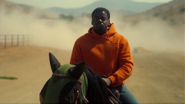 Peele teases these threads in the first minutes, with the chatter of sitcom dialogue and a shot of a bloody chimp on the show's trashed set. Then we are at the California horse ranch, where OJ Haywood (Kaluuya) and his father (Keith David) hear a strange screeching in the sky. The father soon dies.