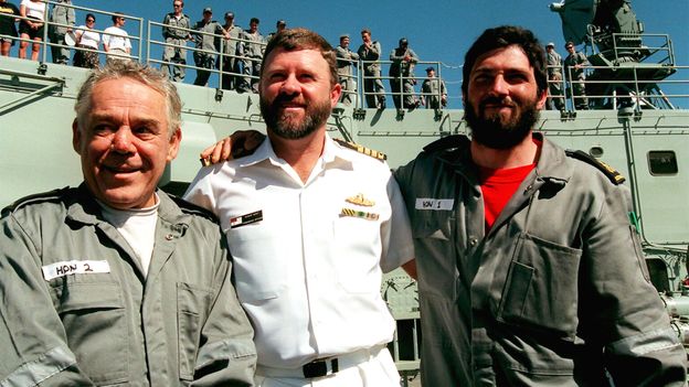 The rescue crew spotted him on the other side of the Exide Challenger as he emerged on the ocean's surface. They raced over and hauled him out of the ocean, weak but alive. As they laid him out on the dinghy's floor, they covered him with insulation blankets. "Someone I think had a spare jacket and chucked one under my head as a little pillow and said, 'You're alright, mate.'" He was almost overcome with gratitude to his rescuers. He recalled to the BBC that one of the Australian Navy crew was "looking after me like a baby, talking, you know, and everything was great, and I gave him a kiss on his beard".