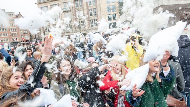 What are pillows really stuffed with? Not physically, but symbolically? The question occurred to me this week with the circulation in the news and social media of a flurry of photos from the 50 cities around the world that staged public celebrations for International Pillow Fight Day. Armed with nothing more than bring-our-own sacrificial cushions, strangers walloped each other in blizzards of playful plumes from Amsterdam to Atlanta, Warsaw to Washington DC. All told, thousands participated in the gleeful bash. But why? Is there anything more to this delightful duffing-up than smacks the eye?