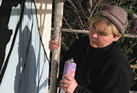 Lle mae dy waith di wedi cael ei arddangos?: O fewn Cymru yn fwy na dim. Sai wedi gwneud ymdrech mawr i ymddangos trwy Brydain o gwbl. Wi'n eitha lico dangos a bod y gwaith o fewn cyrraedd pobl gyffredin. Mae 'na ddarnau yn yr ysbyty, mae 'na ddarnau yn rhyw gaffi yn Aberystwyth, mae na ddarnau lan yn Ultra Cumida. Maen nhw'n cael eu dangos yn gyson ond falle ddim yn yr orïelau mewn sefydliadau sydd â phwysigrwydd. Cliciwch yma i weld lluniau o furlun Tal-y-bont yn cael ei drawsnewid...Angen bathodynnau a bagiau plastig! Mae Ruth Jên wrthi yn casglu bathodynnau a bagiau plastig Cymraeg a dwyieithog ar gyfer cywaith arbennig. Os ydych chi'n gallu helpu rhowch wybod i ni..