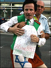 Cafodd y protestiwr, oedd yn gwisgo kilt coch a beret gwyrdd ac yn dal baner â'r geiriau "Israel i gwblhau'r proffwydoliaeth medd y beibl, mae'r ail ddyfodiad yn nesau," ei arestio'n syth.