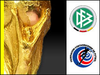 30 mun: Mae amddiffyn Costa Rica yn rhoi gormodedd o le i chwaraewyr canol cae'r Almaen. Mae Bernd Schneider a Bastian Schweinsteiger yn cael modd i fyw i lawr yr esgyll