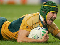 Awstralia: Latham, Mitchell, Mortlock, Giteau, Tuqiri, Barnes, Gregan, Dunning, Moore, Shepherdson, Sharpe, Vickerman, Elsom,