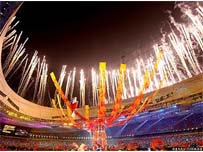 Fe gafwyd arddangosfa tân gwyllt dramatig cyn i'r cystadleuwyr orymdeithio i mewn i stadiwm y 'Nyth' gyda 90,000 o bobl yn bresennol.