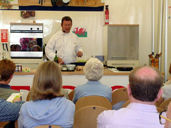 Cogydd S4C Dudley Newberry yn rhoi gwersi coginio i dorf o bobl yn Neuadd Fwyd Tesco.