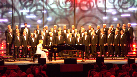 Yna, daeth 150 o ddynion ar y llwyfan yng nghwmni chwech o delynorion a'u harweinydd Dan Puw.