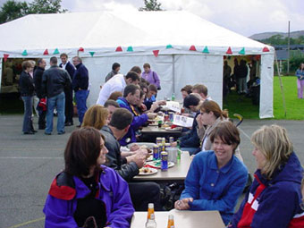 Roedd rhaid gosod byrddau ychwanegol ar iard yr ysgol er mwyn i bawb gael eistedd i lawr i fwyta cinio.
