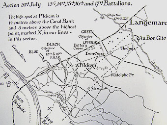 Map yn dangos symudiadau'r Ffiwsilwyr Cymreig ar Orffennaf 31, 1917. 'Roedd Hedd Wyn gyda'r 15fed bataliwn. Nod y 15fed oedd yr hyn a elwir yn linell werdd ar y map. (Mae'r llun nesa yn dangos y linell yn fwy manwl).