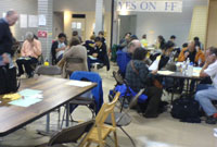 Erbyn yr amser i mi gyrraedd yr oedd y swyddfa yn dechrau llenwi gyda gwirfoddolwyr brwd. Gan fod yr un swyddfa yma yn cyflym orlenwi gofynnwyd i mi ymuno â thîm o dri mewn ail swyddfa a fyddai'n rhoi cwrs dau funud i'r rhai a fyddai'n ffonio am oriau maith.