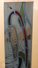 Ar gefn y gadair a wnaed gan Glan Evans gwelir trwy ffenest storws dywysen a'i phen i lawr.