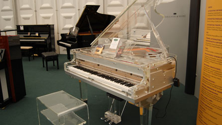 Bydd yn reit hawdd adnabod y piano Schreiner ar safle Coach House gan ei bod wedi ei gwneud o berspecs tryloyw.
