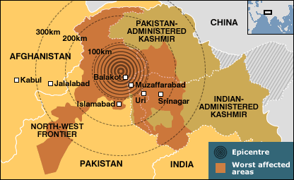 Indie a Pákistán začaly částečně spolupracovat při humanitárním úsilí v oblasti Kašmíru. Indické úřady udělaly výjimku ze zákazu pohybu osob přes hranice a dovolily pěti rodinám z Muzaffarabádu v pákistánské části Kašmíru přejít do indického Paňdžábu. Pákistán na oplátku organizuje přesun jedné rodiny z indické strany kašmírské hranice do Pákistánu. Indické letectvo mezitím přepravilo do Pákistánu zásilku léků, dek a stanů. Zpravodaj BBC v regionu ale uvádí, že symbolické úsilí ze strany tradičních nepřátel, kteří si oba činí nároky na celé území Kašmíru, stále nepředstavuje úplnou přeshraniční spolupráci, jaká by byla potřebná pro koordinování humanitární pomoci. V Indii přes tisíc mrtvých Indický premiér Manmóhan Singh, který navštívil zničené oblasti v indické části Kašmíru, uvedl, že potvrzený počet obětí tam stoupl na třináct set. Podle oficiálních zdrojů se toto číslo ještě zvýší, protože do mnoha odlehlých vesnic se záchranáři ještě nedostali. Singh řekl, že indická armáda dělá na pomoc postiženým vše, co je v jejích silách, a dodal, že si je vědom nedostatečnosti pomoci. Zpravodaj BBC ve Šrínagaru uvádí, že úzké cesty křižující kašmírské údolí jsou zaplněné konvoji s pomocí a dobrovolníci se snaží proniknout do nejvzdálenějších osad. MAPA POSTIŽENÉ OBLASTI