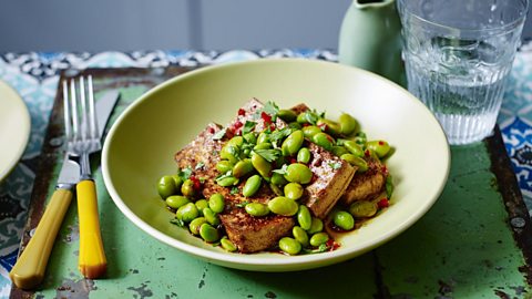 Edamame are young soya beans, containing 11g protein per 100g, which can be added to salads, or cooked in broths and curries.