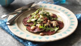 Thinly sliced marinated tuna makes a stunning, yet surprisingly easy starter, served with a mixed bean salad.