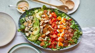 The classic American Cobb salad is based on chopped salad leaves, with chicken or turkey, bacon, eggs, avocado, blue cheese and chives. You can arrange all the topping ingredients in pleasing lines, or scatter them over the chopped-leaf base.