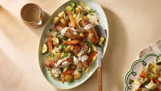 A hearty sausage supper, served with an easy, creamy mustard sauce. This recipe also works brilliantly with veggie sausages.