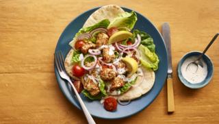 A fast way to cook chicken for a colourful kebab-like salad, served with warm pitta bread. Feel free to top with any of your favourite sauces and dressings.