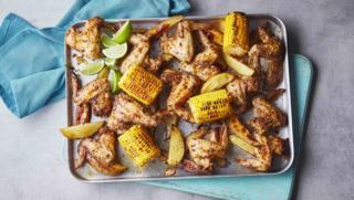 The ultimate budget chicken traybake dinner. Piri-piri chicken wings with corn on the cob and potato wedges. This is so easy to prepare it makes a great midweek feast.