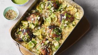 A vibrant, no-fuss dinner featuring golden chicken thighs baked over rice with courgette and roast lemon slices. The herby tahini drizzle, crumbled feta and toasted seeds add texture and crunch.