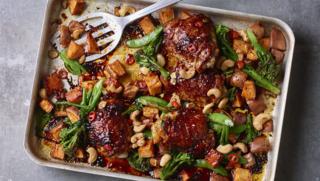 This vibrant traybake brings together golden chicken thighs with sweet potatoes, broccoli and sugar snap peas. The tangy orange glaze with honey, soy and chilli gives a sticky-sweet finish, making it an easy family dinner with plenty of flavour.