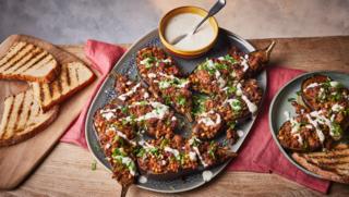 Ottolenghi’s roasted aubergines are topped with aromatic spiced lamb for a comforting Middle Eastern-inspired supper.