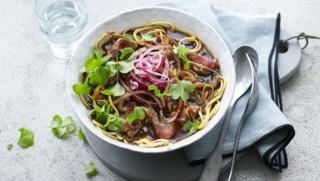 A simple yet impressive steak ramen-style noodle bowl for one or two – slices of griddled sirloin and quick-pickled onions in a richly flavoured broth.