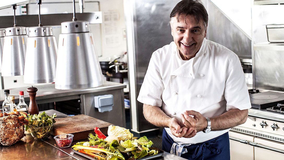 He starts his masterclass with the most traditional of British dishes, roast beef and yorkshire pudding. Raymond cannot resist French-trimming the beef, though. Roasting is a technique that can work well with a robust fish. Raymond shows how to do it with a piece of tasty turbot on a bed of fennel.