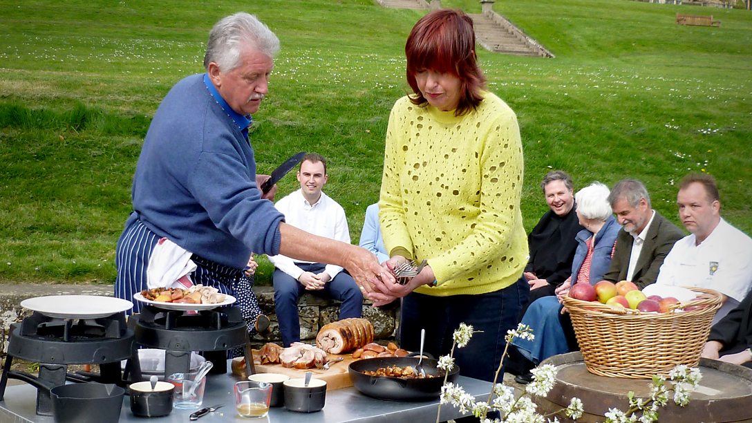 Janet is delighted to be given a private tour of Ampleforth Abbey's chapel and its Robert 'Mouseman' Thompson furniture while Brian meets some local middlewhite pigs. A tour of Ampleforth's orchard delivers the final ingredients for Brian's celebratory dish - roast porchetta with bread pudding and cider brandy-glazed apples - all cooked for the friends made along the way, against the glorious backdrop of the abbey.
