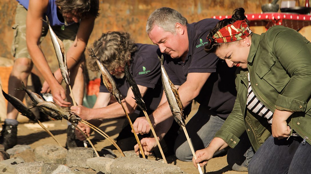 Sam and Shauna also teach the Ferryside Lifeboat community how to make a New England-style fish and cockle chowder served with laverbread, and mackerel smoked on sticks over an open fire on the beach, served with an African-style zingy chermoula dip.