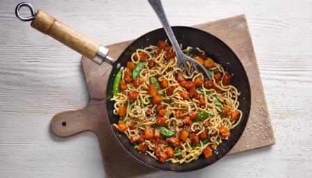 - 3 x 150g packs straight-to-wok medium or thick noodles, heated according to the packet instructions