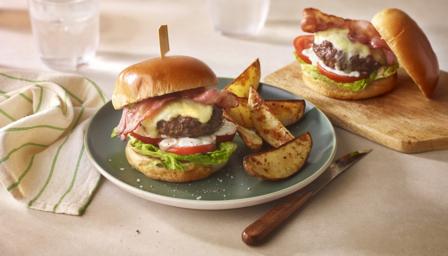 Top the burgers with the cheese. Cook at 200C for 2 minutes, or until the bacon is cooked and beginning to crisp and the cheese has melted. Serve the burgers in the toasted buns with sliced tomatoes, lettuce and mayonnaise. Top with the bacon and serve with the potato wedges.