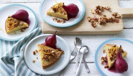 Decorate the cake with the orange strips and nut brittle and serve with the poached pears and crème fraîche.