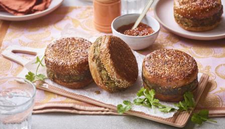 A classic Indian aloo gobi but not as you know it! Nestled between soft toasted burger buns is a spicy potato and cauliflower patty and sweet and sour tamarind chutney. Try my take on Indian street food, tawa burgers. Perfect for parties, picnics and more.