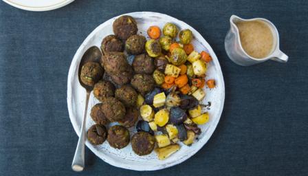 Apricot, chestnut and aduki balls with roasted vegetables and white wine miso gravy