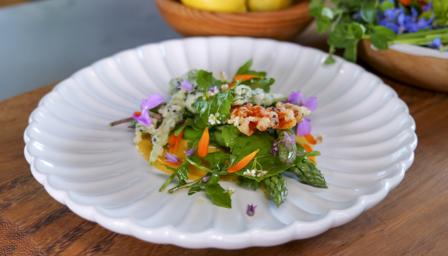 To serve, place the salad leaves into a large bowl and dress with the vinaigrette and chive petals. Pour the hollandaise into the centre of two serving plates. Top with the salad and then the tempura flowers, blanched asparagus, chive flowers and the battered fresh herbs.