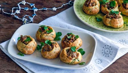 Spicy aubergines in a crisp choux pastry case make perfect veggie canapés. Even better, they can be made in advance and reheated just before serving.