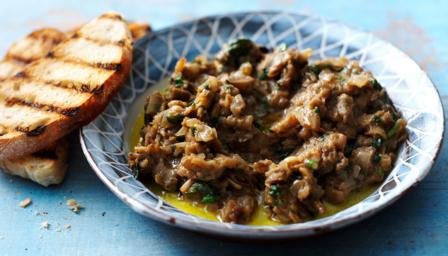 You can cook the whole aubergine over the barbecue until the outside is charred and the inside is soft to the point of collapse.Scoop out the insides and blend with the onion and garlic.