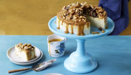 Reheat the caramel if it has cooled too much, and serve with slices of cheesecake and crumble.