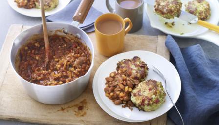 Stir the fresh herbs through the beans, remove the cinnamon stick and serve with the hash browns.