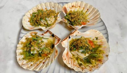 Baked scallops with sea herbs and breadcrumbs