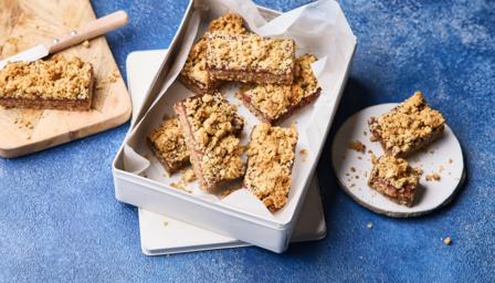 To make the crumble topping,mix the oats, flour, and sugar together in a bowl. Rub in the butter with your fingers until the mixture resembles coarse crumbs. Sprinkle evenly over the date caramel.