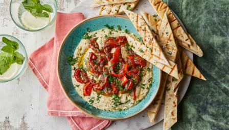 Cooking aubergine on the barbecue takes the smokiness off the scale! Serve topped with barbecue-cooked red peppers and toasted pittas for dipping.