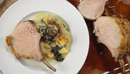 To serve, carve the pork loin rack into six chops. Place one onto each serving plate and spoon the Swiss-chard gratin alongside.